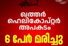 ഖത്തർ ഹെലികോപ്റ്റർ അപകടം: ആറ് പേരുടെ മൃതദേഹങ്ങൾ കണ്ടെത്തി; ഒരാൾക്കായി തിരച്ചിൽ തുടരുന്നു