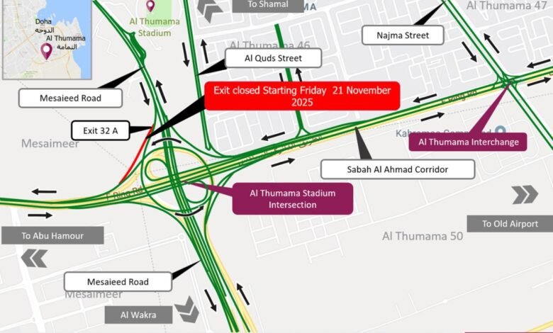 അൽ തുമാമ സ്റ്റേഡിയം ഇന്റർചേഞ്ചിലെ എക്സിറ്റ് 32A താൽക്കാലികമായി അടച്ചിടുന്നതായി പൊതുമരാമത്ത് അതോറിറ്റിയായ അഷ്ഗാൽ അറിയിച്ചു.