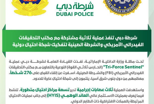 അന്താരാഷ്ട്ര തലത്തിൽ പ്രവർത്തിക്കുന്ന വൻ തട്ടിപ്പ് ശൃംഖലയിലെ 276 അംഗങ്ങളെ ദുബായ് പോലീസ് അറസ്റ്റ് ചെയ്തു. യുഎസ് അന്വേഷണ ഏജൻസിയായ എഫ്ബിഐ (FBI), ചൈനീസ് പോലീസ് എന്നിവരുമായി സഹകരിച്ച് നടത്തിയ സംയുക്ത ഓപ്പറേഷനിലൂടെയാണ് സംഘത്തെ പിടികൂടിയത്. അറസ്റ്റിലായവരിൽ ഭൂരിഭാഗവും തെക്കുകിഴക്കൻ ഏഷ്യയിൽ നിന്നുള്ളവരാണെന്ന് അധികൃതർ വ്യക്തമാക്കി.