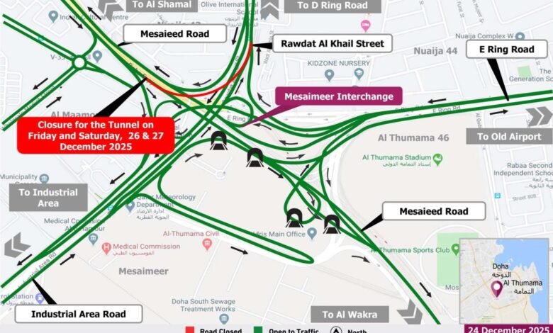മെസൈദ് റോഡിലൂടെ വരുകയും റൗദത്ത് അൽ ഖൈൽ സ്ട്രീറ്റിലേക്ക് പോകുകയും ചെയ്യുന്ന വാഹനങ്ങൾ ഉപയോഗിക്കുന്ന മെസൈമീർ ഇന്റർചേഞ്ച് ടണൽ താൽക്കാലികമായി അടച്ചിടും.