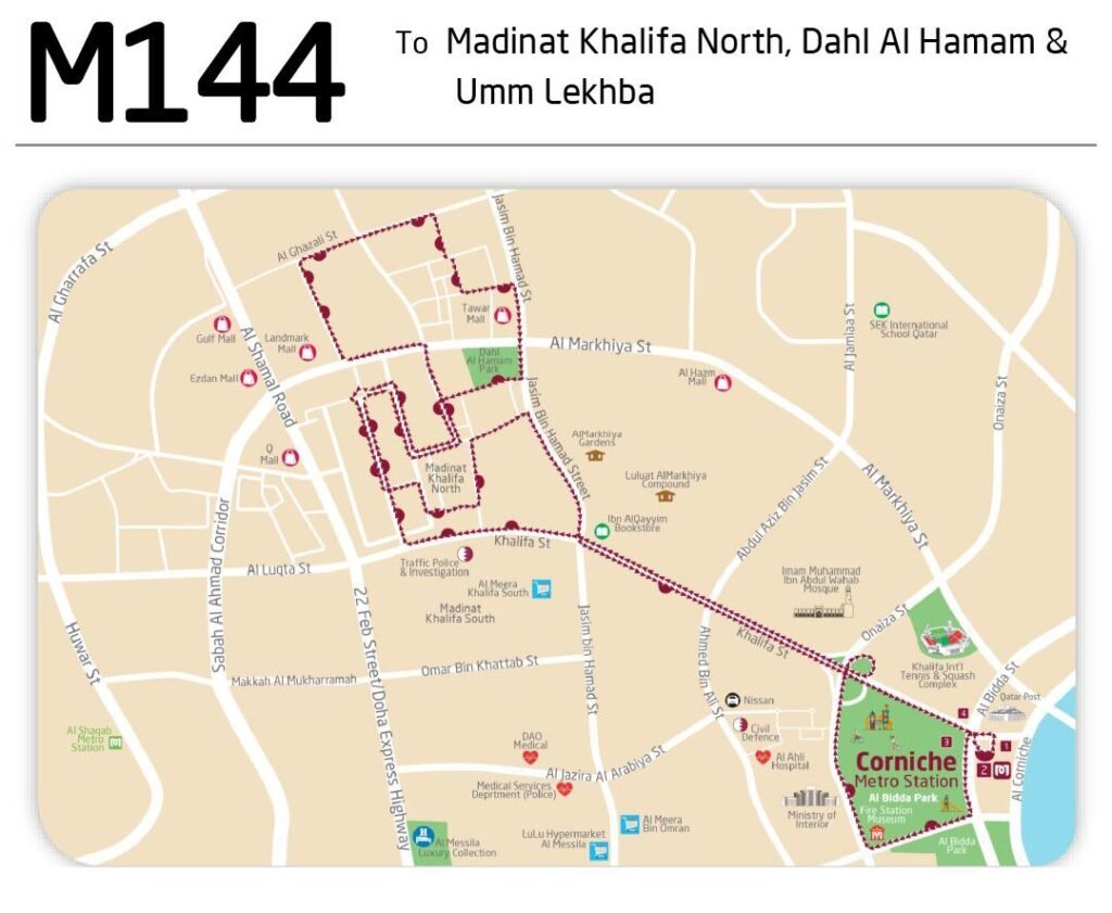 മദീനത്ത് ഖലീഫ നോർത്ത്, ദാൽ അൽ ഹമാം, ഉം ലെഖ്ബ എന്നീ പ്രദേശങ്ങളിൽ M144 മെട്രോലിങ്ക് സേവനം നൽകുന്നു.