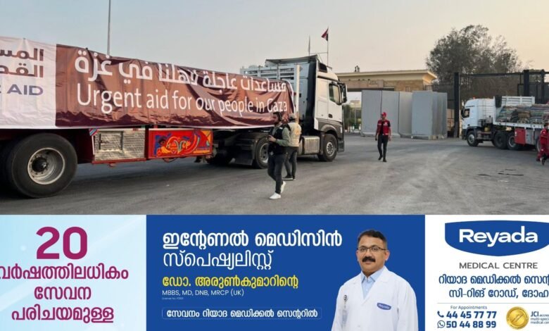 ഫലസ്തീൻ ജനതയ്ക്കായുള്ള ഖത്തരി ദുരിതാശ്വാസ സഹായത്തിന്റെ പുതിയ ബാച്ച് റാഫ അതിർത്തി വഴി ഗസ്സയിലെത്തി.