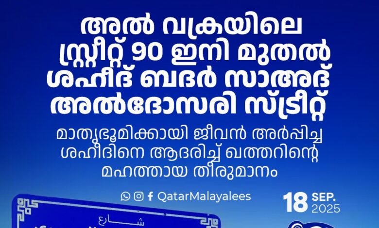 ദോഹയിൽ ഇസ്രായേലി ആക്രമണ ദിവസം തന്റെ കർത്തവ്യങ്ങൾ നിർവഹിക്കുന്നതിനിടെ മരണപ്പെട്ട രക്തസാക്ഷി വാറന്റ് കോർപ്പറൽ ബദർ സാദ് മുഹമ്മദ് അൽ-ഹുമൈദി അൽ-ദോസാരിയുടെ സ്മരണയ്ക്കായി അൽ വക്രയിലെ സോൺ 90 ലെ 1025-ാം നമ്പർ സ്ട്രീറ്റിന് പുനർനാമകരണം ചെയ്തു.
