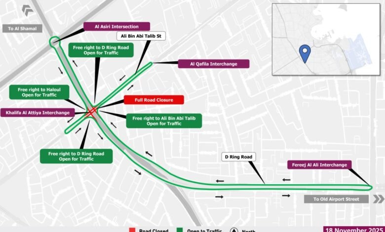 ഖലീഫ അൽ അതിയ്യ ഇന്റർചേഞ്ചിലെ ഗതാഗതം താൽക്കാലികമായി നിർത്തിവയ്ക്കുന്നതായി പൊതുമരാമത്ത് അതോറിറ്റിയായ അഷ്ഗാൽ അറിയിച്ചു.