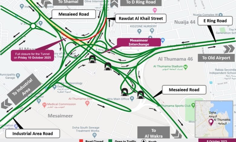 മെസൈദ് റോഡിൽ നിന്ന് റൗദത്ത് അൽ ഖൈൽ സ്ട്രീറ്റിലേക്ക് വരുന്ന വാഹനങ്ങൾക്കുള്ള, മെസൈമിർ ഇന്റർചേഞ്ച് ടണൽ താൽക്കാലികമായി അടച്ചിടുമെന്ന് പൊതുമരാമത്ത് അതോറിറ്റിയായ അഷ്ഗാൽ അറിയിച്ചു.