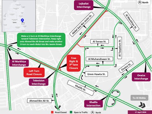 ദോഹയിലെ ടെലിവിഷൻ ഇൻ്റർസെക്ഷനിൽ (Television Intersection) താൽക്കാലിക ഗതാഗത നിയന്ത്രണം ഏർപ്പെടുത്തുന്നതായി പൊതുമരാമത്ത് അതോറിറ്റി (അഷ്ഗാൽ) അറിയിച്ചു. ഖലീഫ ഇൻ്റർസെക്ഷനിൽ നിന്ന് അബ്ദുൽ അസീസ് ബിൻ ജാസിം സ്ട്രീറ്റിലേക്ക് പോകുന്ന ഭാഗത്തെ ഫ്രീ-റൈറ്റ് ലെയ്നിലും മൂന്നാമത്തെ ലെയ്നിലുമാണ് നിയന്ത്രണം ഏർപ്പെടുത്തുന്നത്. റോഡുകളുടെ ആനുകാലിക അറ്റകുറ്റപ്പണികൾ നടത്തുന്നതിൻ്റെ ഭാഗമായാണ് ഈ നടപടി.